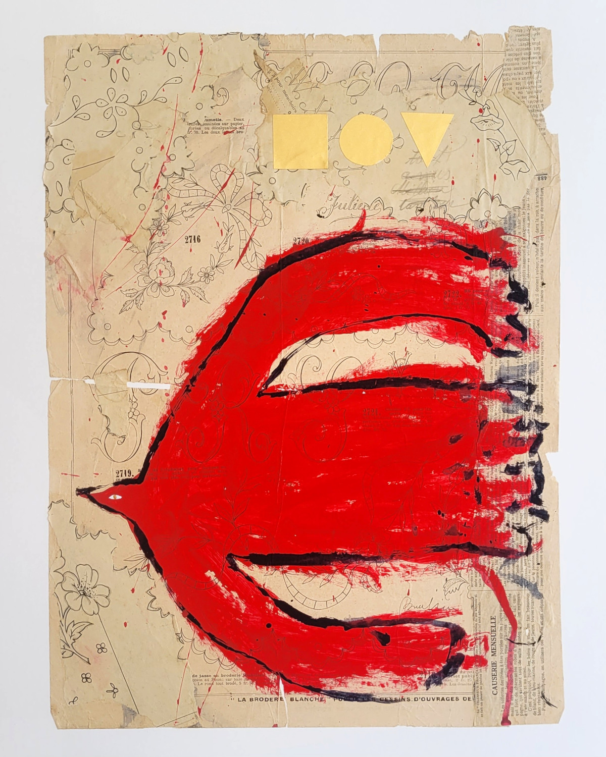 This abstract expressionist original artwork was hand painted with acrylic on a vintage sewing pattern sheet of a French magazine from 1906. It is attached to a quality watercolor paper. Collage details with golden paper.
