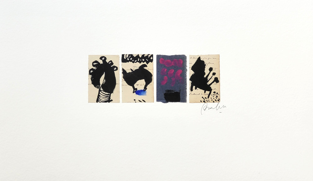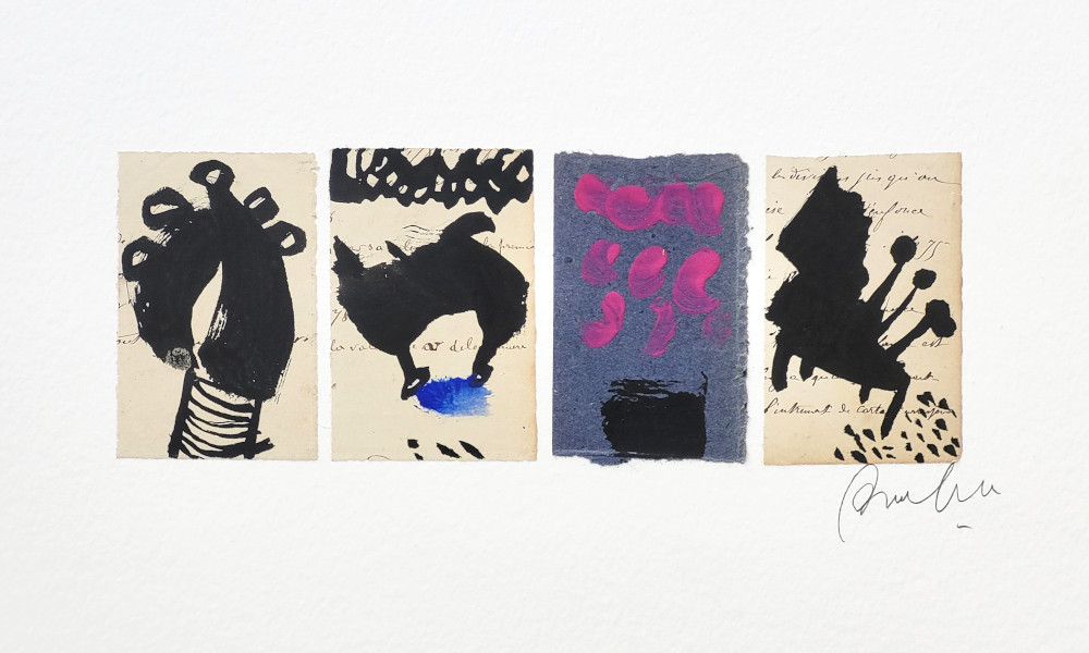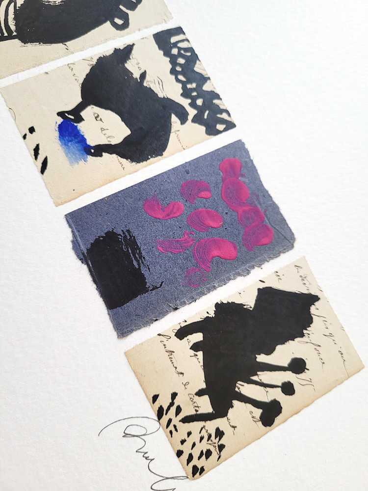 This original ink painting was hand-made on original handwritten vintage paper scraps. It is attached to a watercolor paper sheet.
